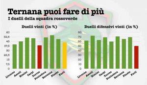 Proseguendo nell’analisi dei dati ci siamo concentrati sul confronto dei duelli: ed emerge un’altra considerazione. A sinistra ci sono i duelli generali, sia offensivi che difensivi: non è un dato alto, anzi, la Ternana ha fatto meglio in altre occasioni. Il dato più “strano” però è quello dei duelli difensivi: contro il Forlì è il più basso della stagione.