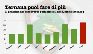 Nel match contro il Forlì, la Ternana ha perso molti palloni, quasi un record stagionale. Allo stesso tempo, le palle alte recuperate (cioè nella trequarti avversaria) sono state poche. Questo indica che la squadra è stata poco aggressiva: ha concesso troppo e non è riuscita a portare la pressione necessaria in avanti. Per magari poter recuperare in fretta il pallone. È una questione figlia certamente di un piano gara più attendista rispetto alle altre gare e contemporaneamente di una ferocia che non si è vista in maniera costante durante la partita.